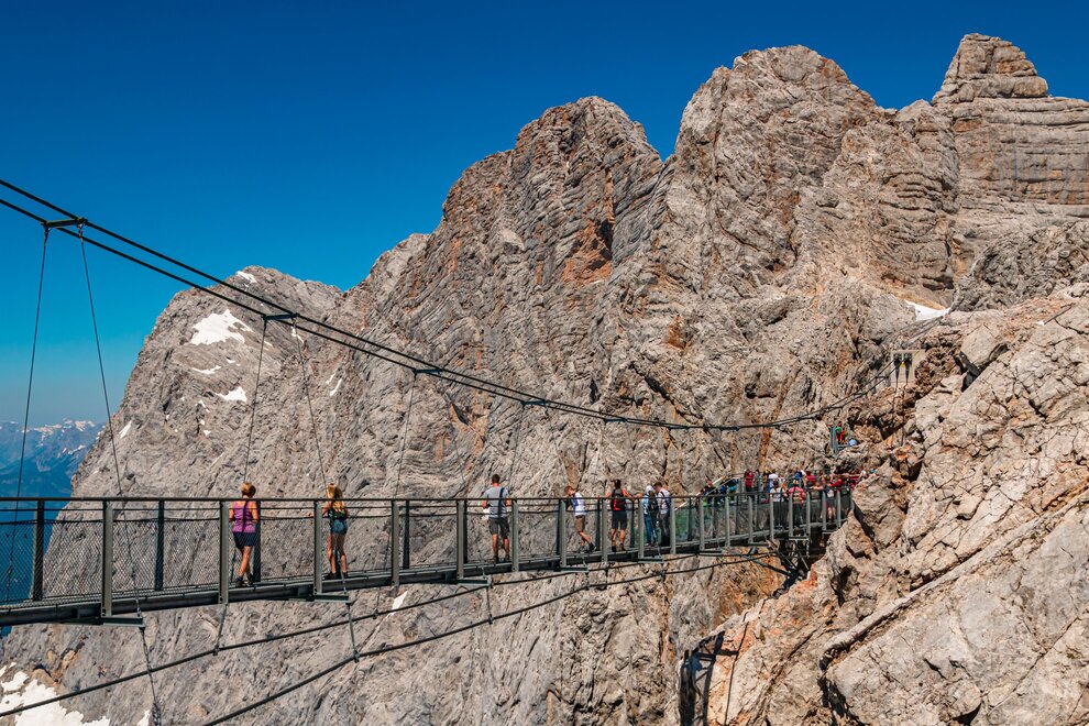 „Nervenkitzel mit Aussicht“ verspricht die Dachstein Hängebrücke, welche mit der „Treppe ins Nichts“ für atemberaubende Weit- und Tiefblicke sorgt.