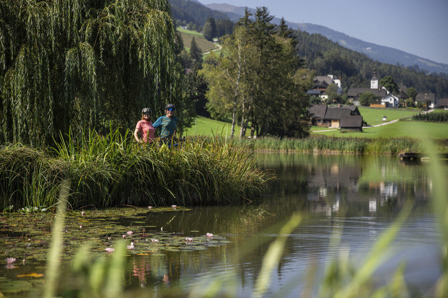 Zwei Radfahrer fahren einen Uferweg am See entlang, umgeben von Bäumen