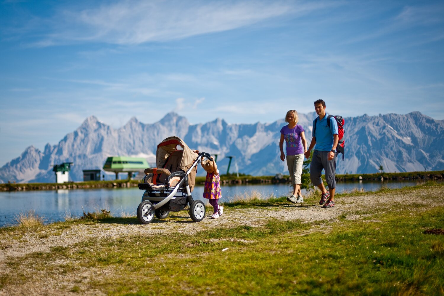 Leicht begehbare Wege wie der Baumhoroskopweg in Rohrmoos, der Bodensee-Rundweg, Teile des Wilde Wasser Wegs (über den Forstweg zum Riesachsee) sowie viele Themenwege auf der Planai und Reiteralm sind auch mit dem Kinderwagen gut machbar.