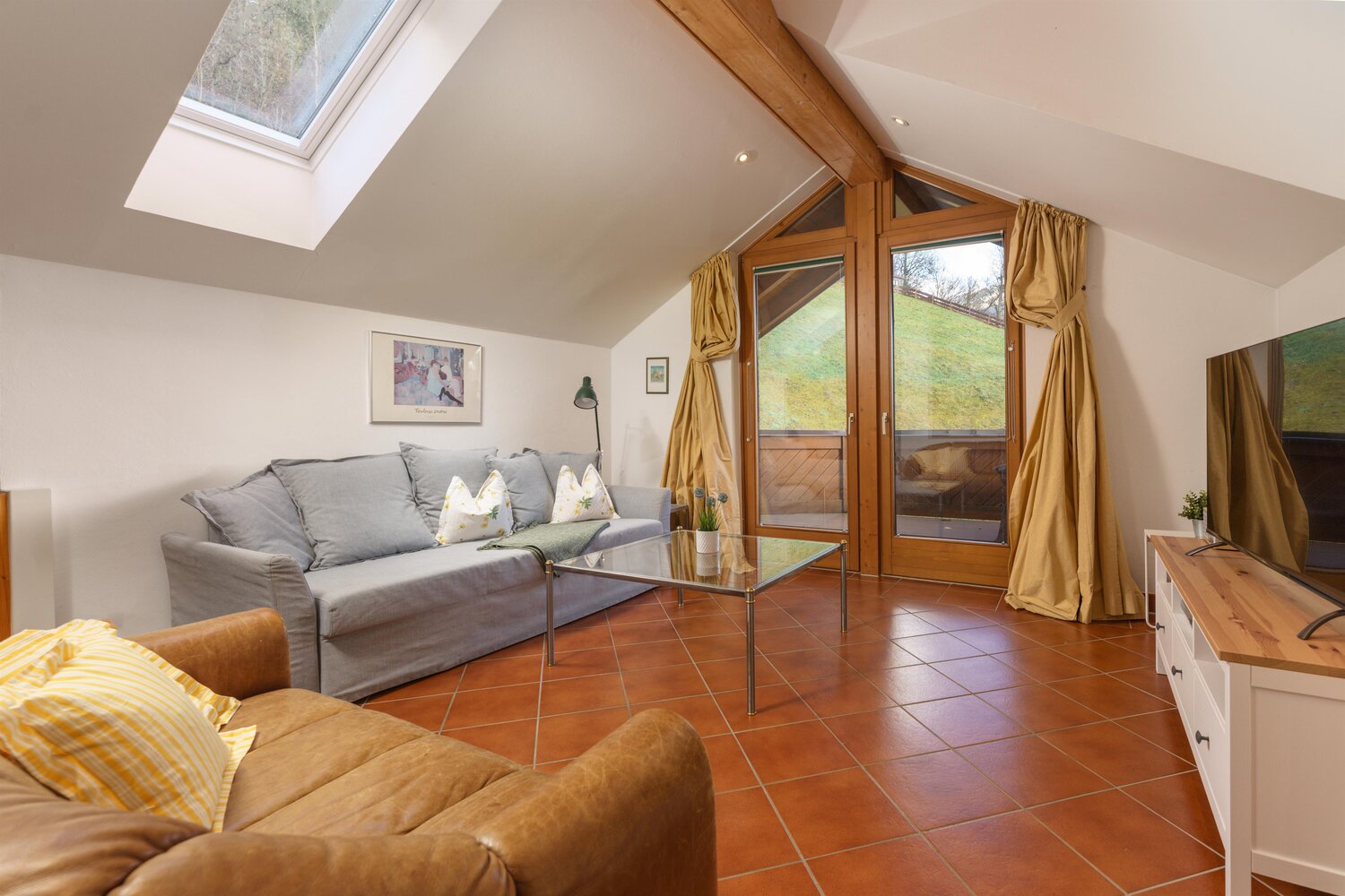 Heller Wohnraum mit Dachfenster, Sofas und Regalen