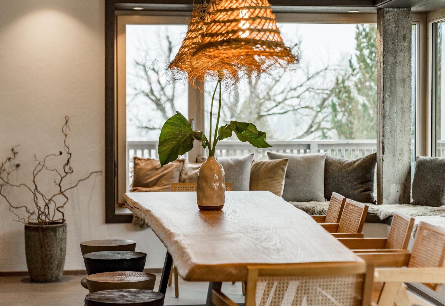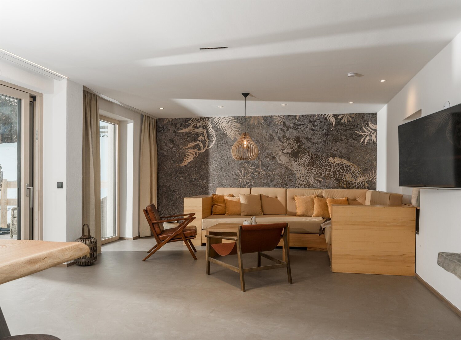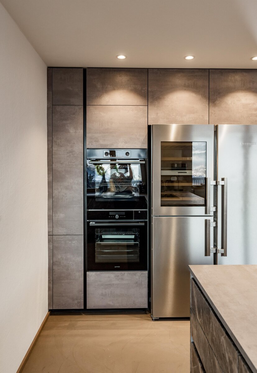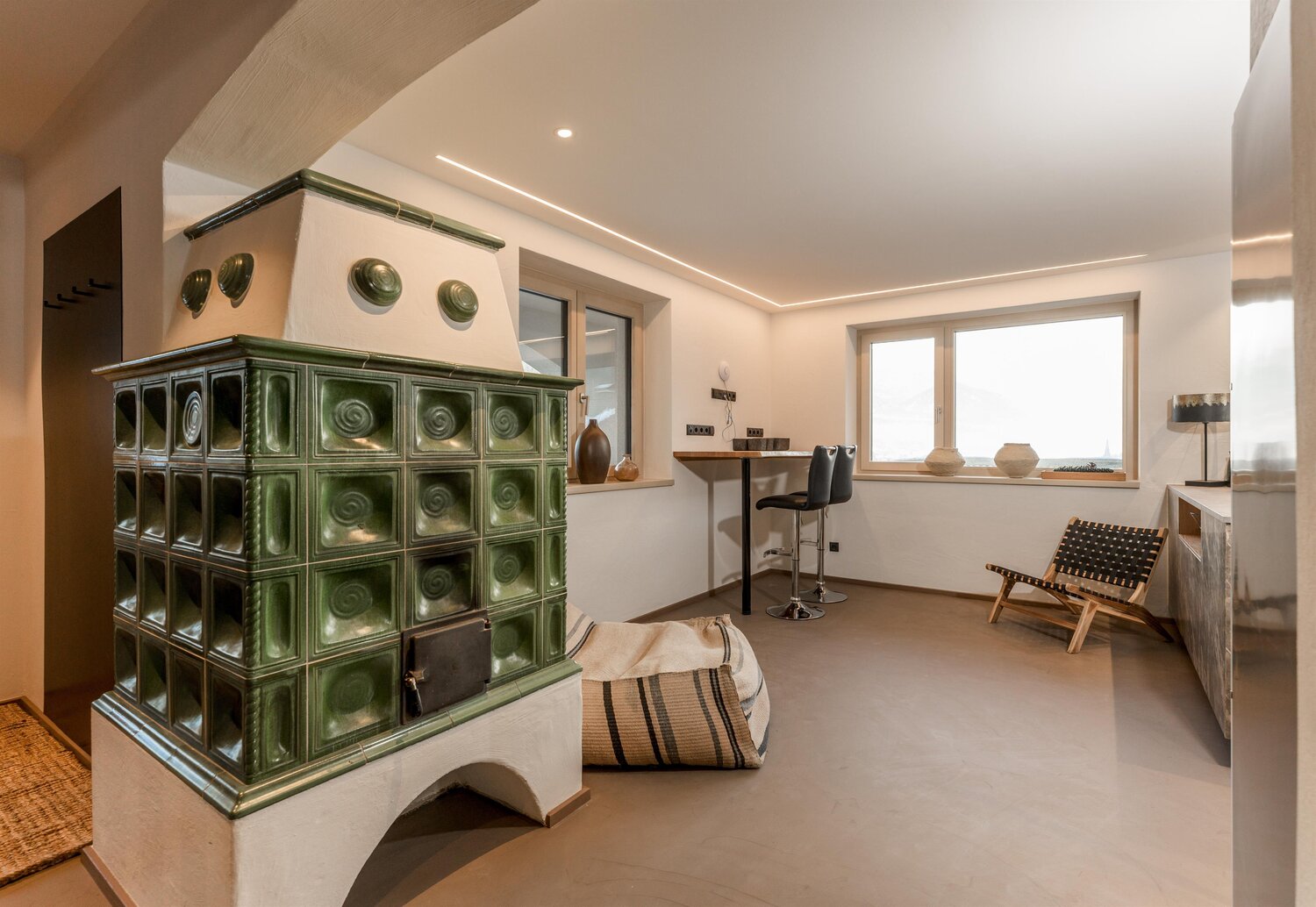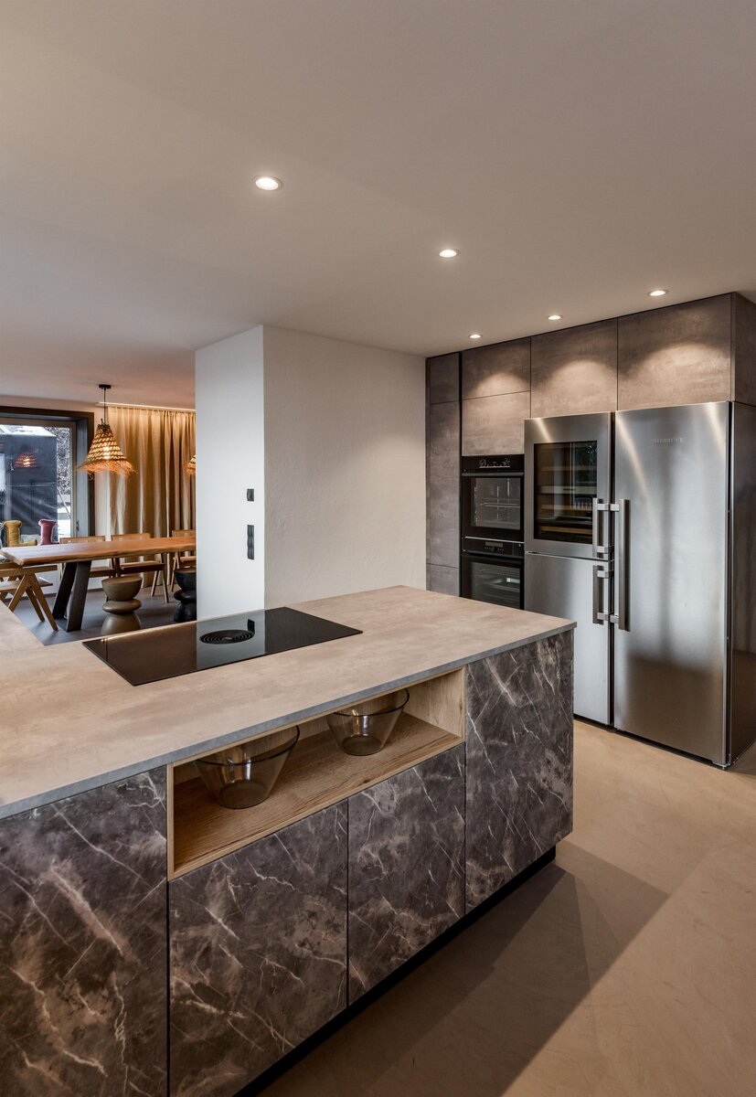 • Eat & Meet & Chill Area mit komplett ausgestatteter Küche, großer Esstisch, XXL Couch, Kachelofen, Medientisch und Smart TV