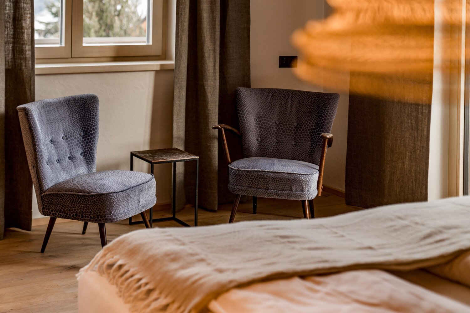 Massives Holzbett mit Pendelleuchten und gemusterter Tapete