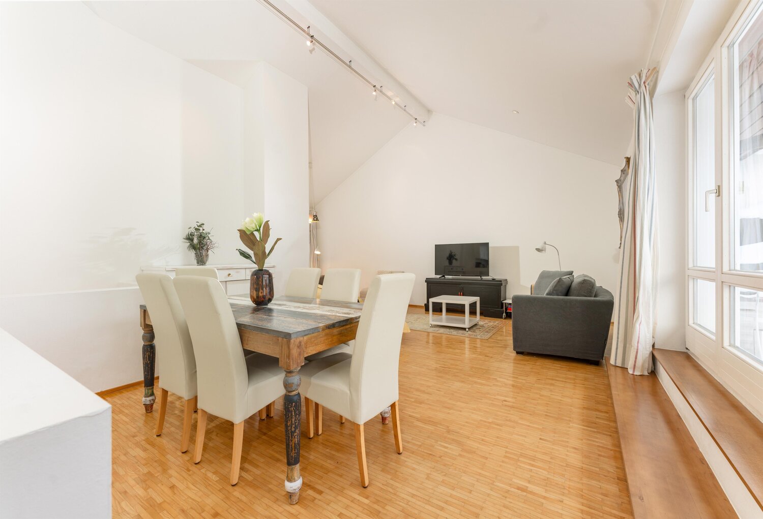 Heller offener Wohn- und Essbereich mit Holztisch