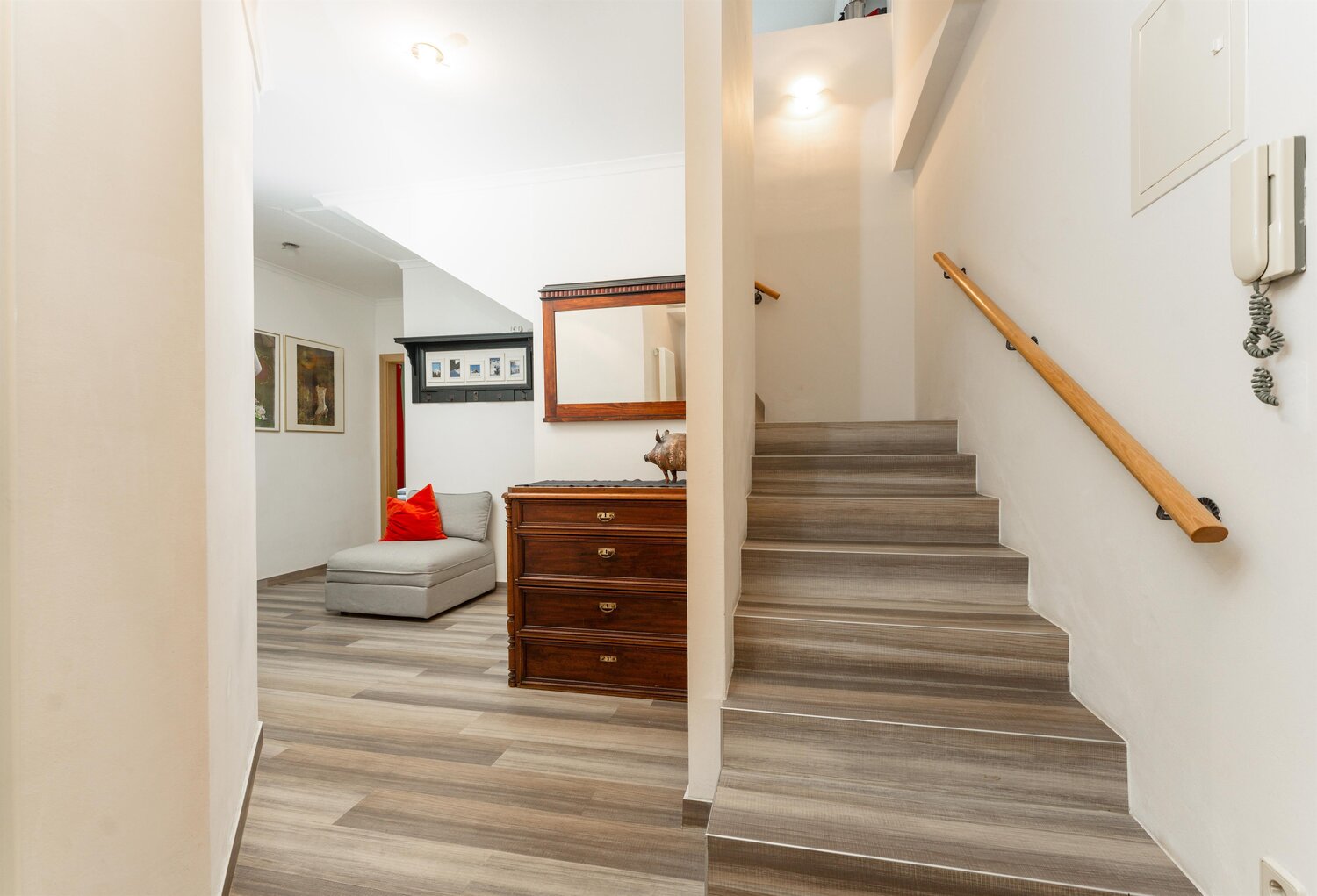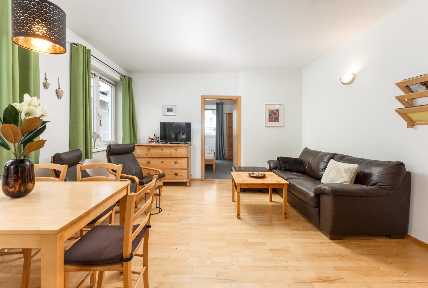 Helles Wohnzimmer mit Holzboden, Sofa und Essecke