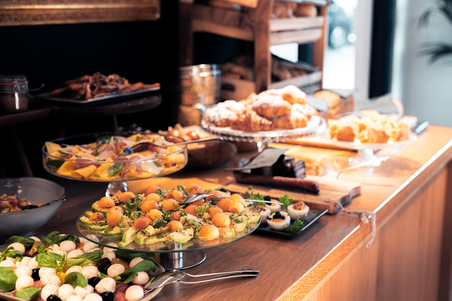 Frisches Gebäck, regionale Wurst- und Käsespezialitäten, Eierspeisen, Müsli, Obst, Säfte und Kaffee. Auf Anfrage auch vegetarische und vegane Optionen.